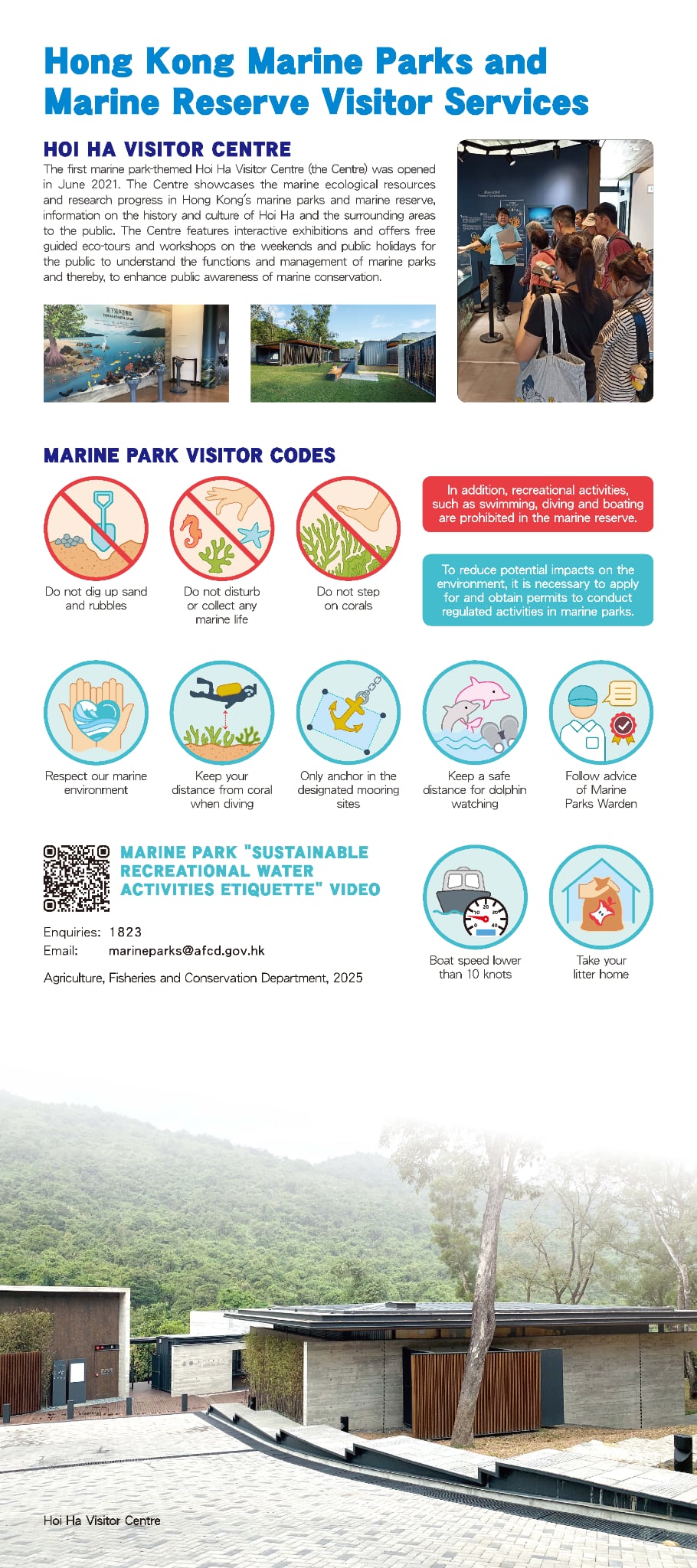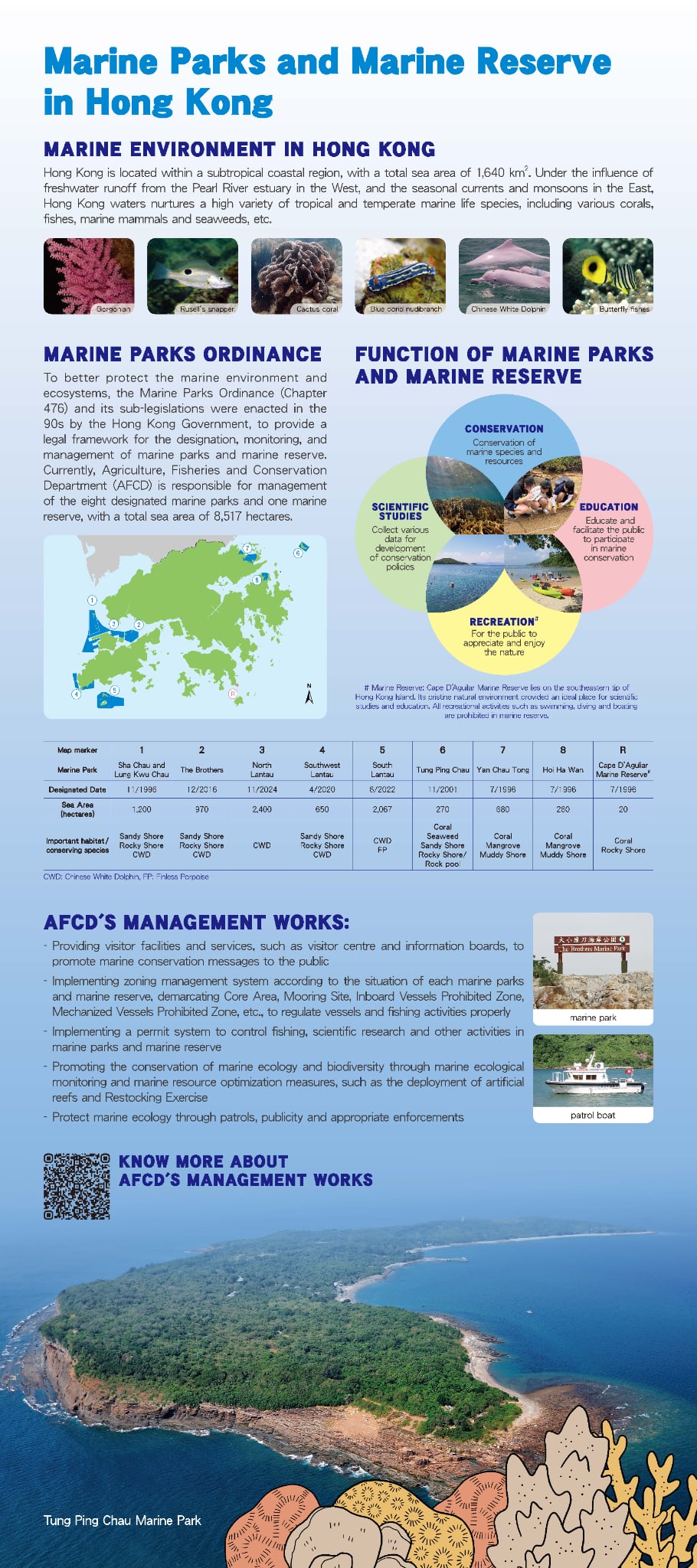 Marine Parks Exhibition Panels Lending ServiceAFCD has produced a set of exhibition panels (About 180cm x 80cm each, 4 panels in total) on the information of marine parks. Schools and non-profit organisations can apply for borrowing these exhibition panels for display, so as to enhance the public understanding on marine parks ecology and marine conservation. For applying the service, please send an email to marineparks@afcd.gov.hk , and provide the following details (1) School / Organization name; (2) Surname of person-in-charge; (3) Email address; (4) School / Organization address; (5) Office phone number; (6) Mobile phone number; (7) Borrowing date; (8) Returning date; and (9) Exhibition / Event name (If applicable). We will send you a confirmation email once we processed your application. (* Please note the longest lending period for the panels is two weeks only.) Terms of condition Should you have any question, please do not hesitate to contact us at 3468 3701 or marineparks@afcd.gov.hk .
