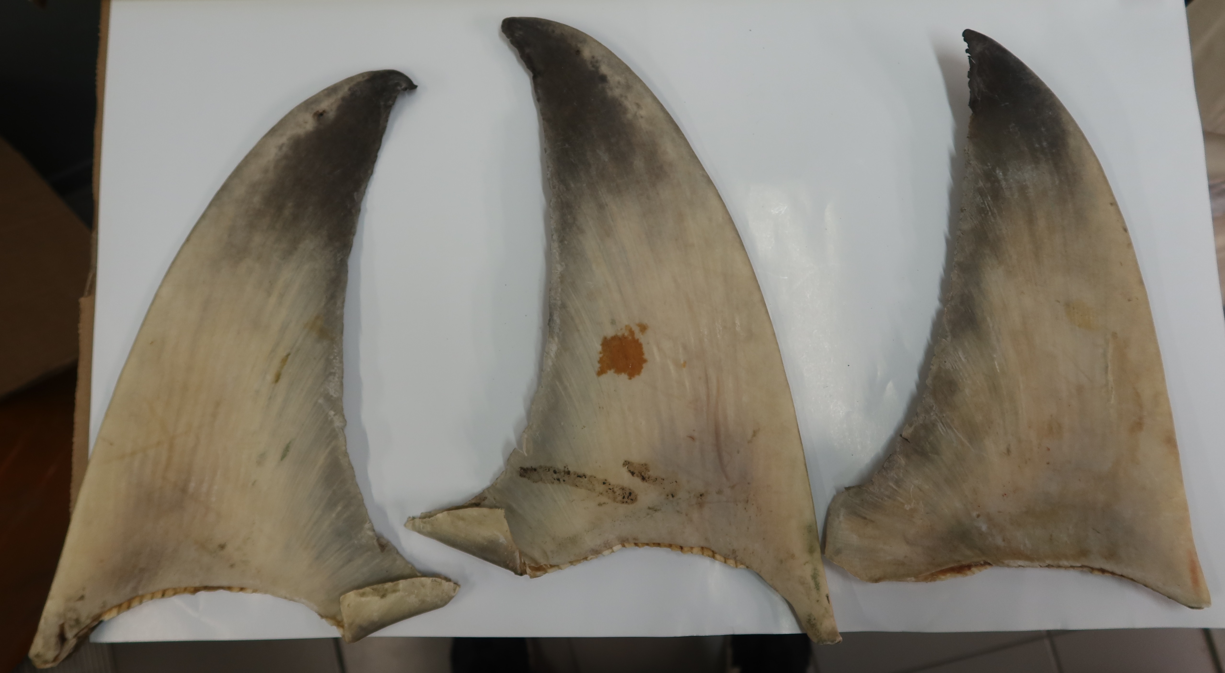 一名女子因非法进口濒危鲨鱼鱼翅,今日(九月二十三日)在区域法院被裁定罪名成立,判处监禁12个月。图示检获的长鳍真鲨鱼翅。