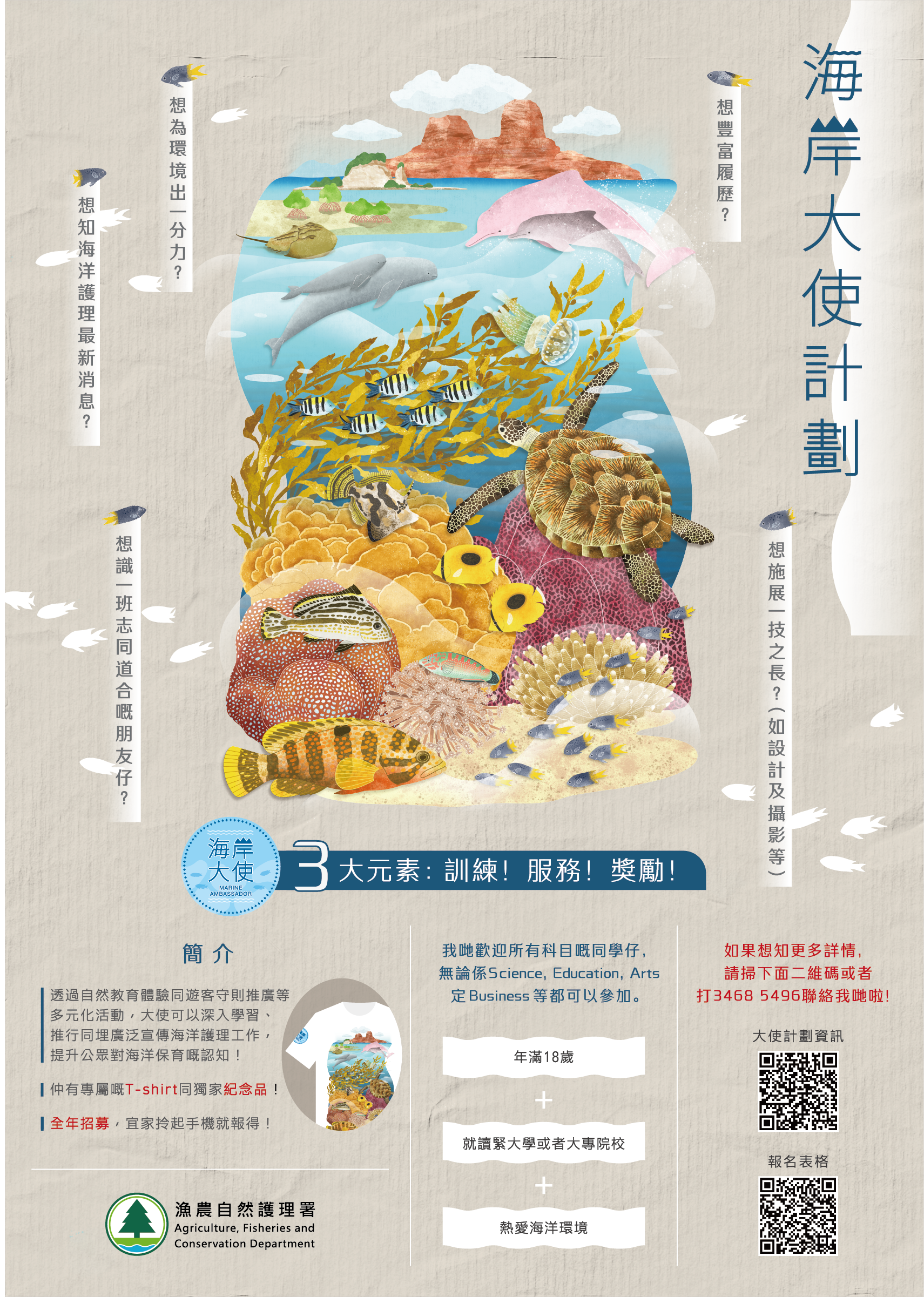 设 立 海 岸 大 使 计 划 ( 前 为 海 岸 公 园 大 使 计 划 ), 是 为 大 专 学 生 提 供 途 径 , 透 过 训 练 、服 务 及 奬 励 三 个 元 素 ,认 识 和 推 广 海 洋 护 理 工 作,藉 此 推 动 公 众 参 与 及 支 持 海 洋 护 理 工 作 和 海 岸 公 园 的 管 理 工 作 。