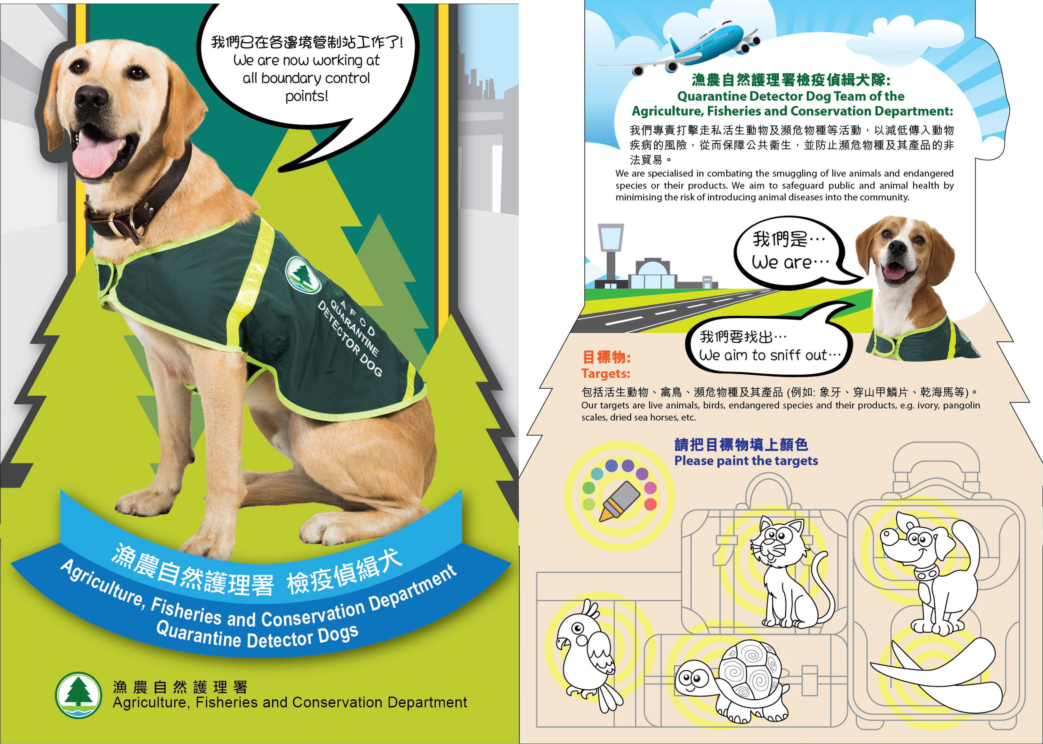 阻 截 走 私 活 动 固 然 是 侦 缉 犬 的 主 要 工 作 , 但 为 了 防 范 于 未 然 , 侦 缉 犬 亦 承 担 了 宣 传 及 教 育 的 任 务 。 领 犬 员 及 其 侦 缉 犬 经 常 到 各 院 校 及 社 区 举 办 讲 座 和 示 范 表 演 , 宣 传 防 止 动 物 走 私 活 动 的 信 息 , 以 及 在 入 境 口 岸 遇 到 侦 缉 犬 执 勤 时 的 正 确 做 法 , 同 时 亦 让 市 民 了 解 侦 缉 犬 的 工 作 及 日 常 生 活 。